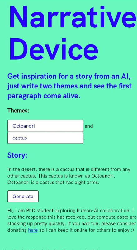 Simpatico questo sito che crea storie con l'IA https://narrative-device.herokuapp.com/