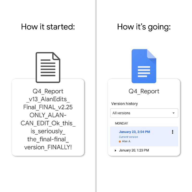 Alessio (Twitter) RT @googledocs: Never ask “who has the most recent version” ever again! → https://goo.gle/3o6hb7Z https://twitter.com/googledocs/status/1668974579027509249/photo/1